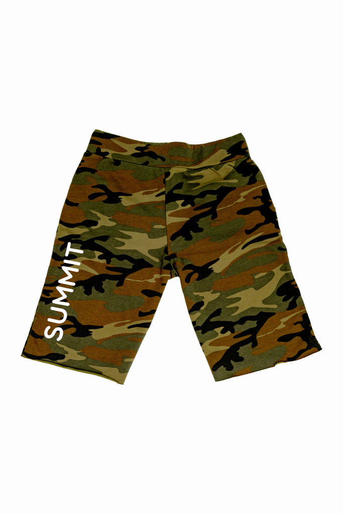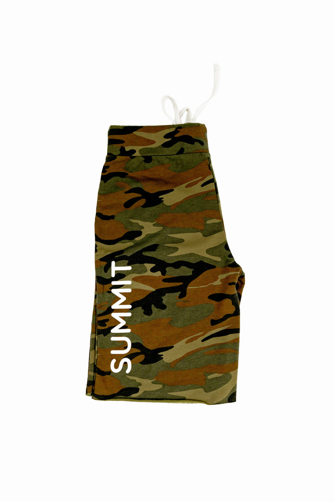 Knee-length, athletic sweat shorts in camo with "Summit" written on the back.