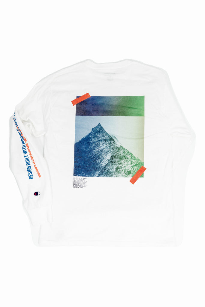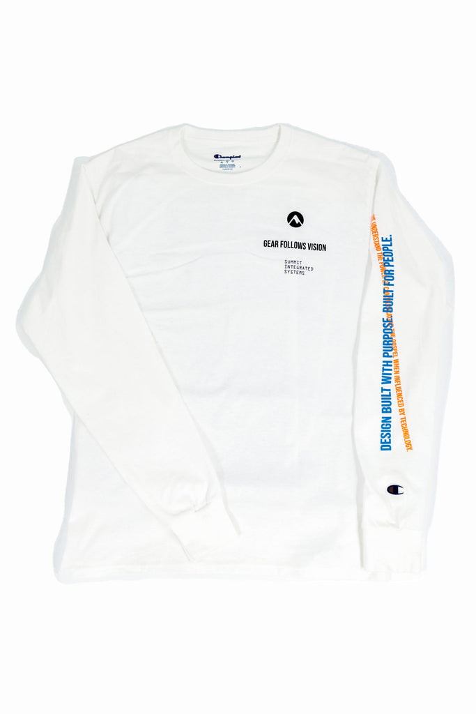 White, long sleeve T-shirt with "Gear Follows Vision" variations written down the arm and a mountain gradient print on the back.